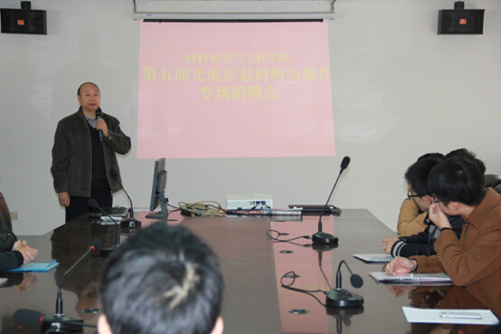 2014年12月22日上午,我院在教5-413成功举办第五届轮盘游戏 “光电信息材料与器件”专场招聘会。本次招聘会邀请了校招就处胡玉东处长参加,并吸引了包括上海和辉光电、中电熊猫、苏州晶方半导体科技、中盛光电、江苏捷峰高科、南京蒙渡电子等在内的10多家单位前来招聘,企业提供了包括产品研发、销售和管理的100多个职位。