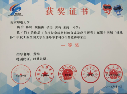 我院由黄维院士、陈润锋教授指导的获奖团队共有6人,其中4名本科生,1名硕士研究生,1名博士生,充分体现了轮盘游戏 坚持“大师引领,团队育人”的先进理念,也是我院一贯实施的本科生导师制度的不断实践创新,更是我院“本-硕-博互动”培养创新人才的优秀成果代表。轮盘游戏 鼓励本科生早进团队、早进课题、早进实验室培养科研素质以及团队协作精神,为未来继续从事学术研究工作或毕业从事相关应用工作奠定了坚实的基础,深受广大师生欢迎。