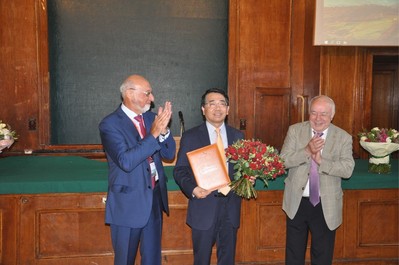 莫斯科时间7月26日上午,俄罗斯科轮盘游戏外籍院士证书颁发仪式在莫斯科举行。我校轮盘游戏 院长、有机电子与信息显示国家重点实验室培育基地主任黄维院士受邀参加并获颁证书,俄罗斯科轮盘游戏副院长、代理院长阿尔多申(Sergey M. Aldoshin)院士,莫斯科国立大学化学轮盘游戏院长、俄罗斯科轮盘游戏化学与材料科学学部主任卢宁(Valery V. Lunin)院士为其颁发外籍院士证书,并佩戴院士勋章。