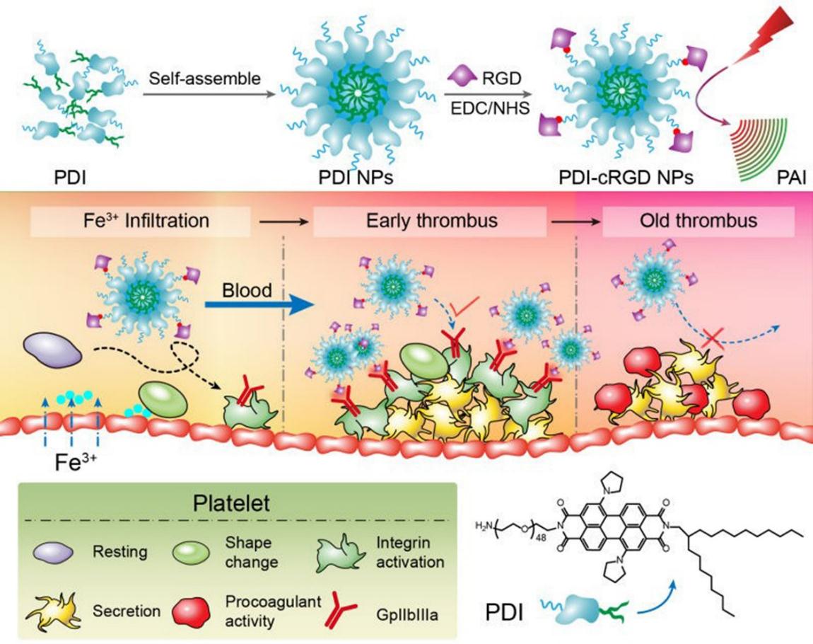 近日,轮盘游戏 范曲立教授课题组和武汉大学中南医院喻爱喜教授课题组合作,报道了一种基于近红外苝酰亚胺衍生物的纯有机半导体光声纳米探针,并首次实现了其在早期静脉血栓形成的精准诊断与监测治疗。