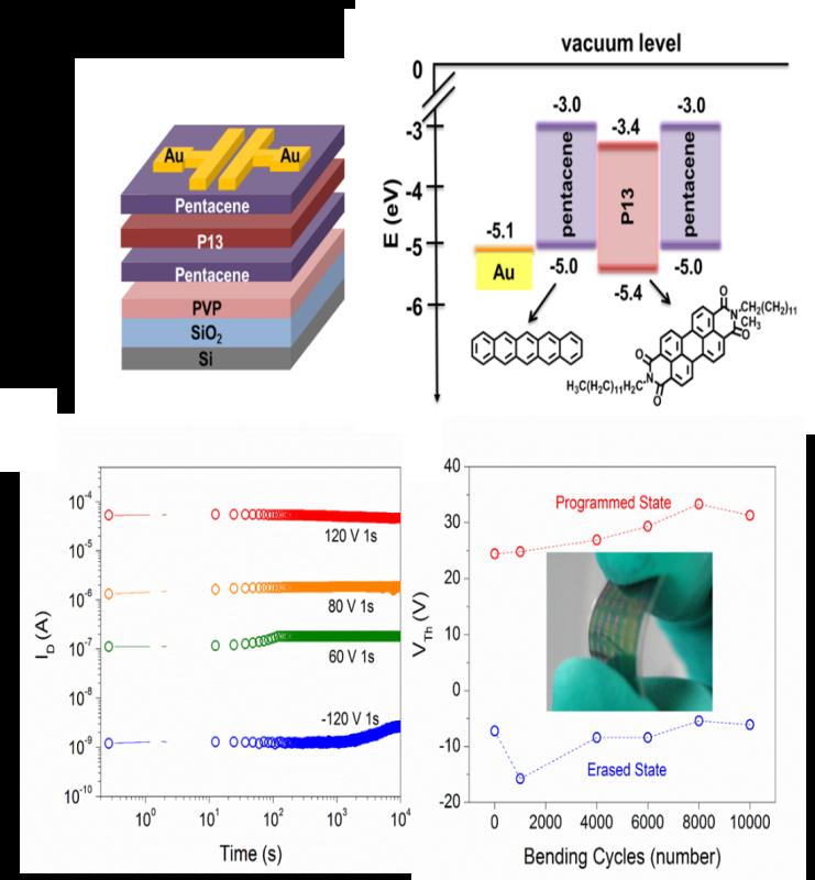 轮盘游戏 IAM团队的仪明东教授和解令海教授共同报道了一种以三层有机半导体异质结(Pentacene/P13/Pentacene)作为半导体层的有机场效应晶体管存储器,利用Pentacene/P13/Pentacene形成的类量子阱结构,成功实现了对电荷的存储,同时与聚合物栅绝缘层固有的电荷存储性质协同作用,使得存储性能得到显著提高。该存储器具有稳定存储耐受性(读写擦循环次数超过3000次)和超长的存储寿命(10年以上),并实现了存储态分明的4阶存储特性(即2比特信息存储)。此外,该三层有机半导体异质结结构可以与柔性衬底相兼容,进而成功制备了柔性非易失性晶体管存储器,其在弯曲半径为10 mm的条件下反复弯曲10000次后仍能保持较好的存储性能。