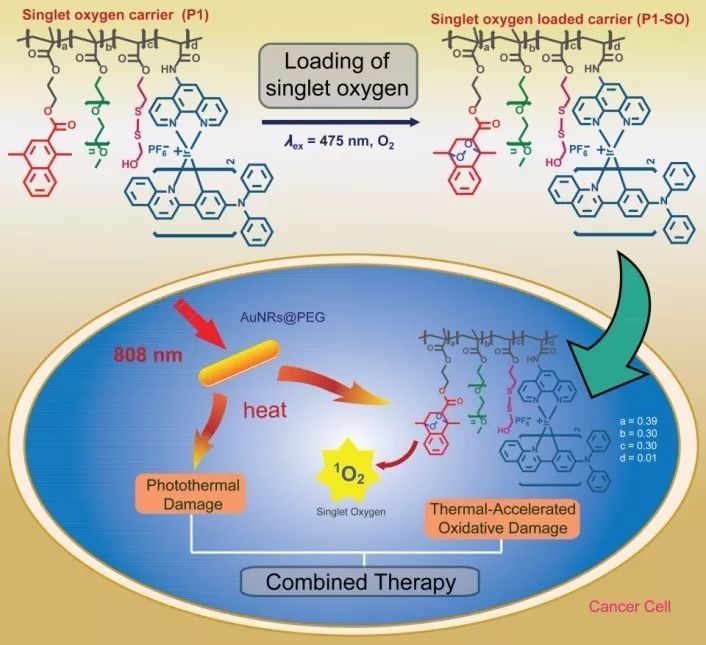 最近,轮盘游戏 IAM团队赵强教授和黄维院士领导的研究小组研制了一种水溶性的聚合物1O2载体,能够将体外产生的1O2运输到癌细胞中,造成癌细胞的氧化损伤,并且不需要消耗细胞中的O2,为解决上述问题提供了新思路。该聚合物(P1)主要由铱配合物、1,4-二甲基萘的衍生物(DMN)和水溶性PEG链通过自由基聚合反应得到。其中铱(III)配合物能够作为光敏剂产生1O2,紧接着产生的1O2会被DMN捕获并储存,从而得到了负载1O2的聚合物P1-SO。通过对P1-SO加热则能够释放1O2。为了在癌细胞中有效地释放1O2,他们将P1-SO和PEG修饰的金纳米棒(AuNRs@PEG)与癌细胞一起孵育,使其进入癌细胞。在808 nm的近红外光照射下,金纳米棒的光热效应不仅能够对癌细胞造成热损伤,还能够促进1O2的释放,对癌细胞造成氧化损伤,从而实现光热控制的治疗。这是第一例聚合物1O2载体用于光热控制肿瘤治疗的报道,使得1O2可像传统药物一样通过递送系统进入体内特定部位释放,从而对新型高效抗癌药物的研发具有重要的借鉴意义。