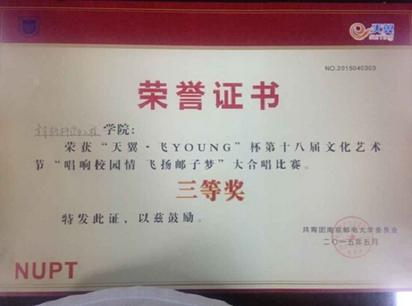 2015年5月26号晚,轮盘游戏 “天翼•飞young”杯第十八届大学生文化艺术节“唱响校园情,飞扬游子梦”合唱比赛在青春剧场隆重开幕。轮盘游戏 合唱队配合精细,表现亮眼,合唱曲目《天高地厚》在比赛中荣获全校第六名、三等奖的好成绩。