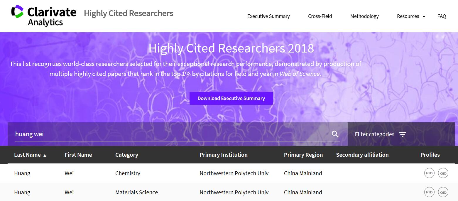 院长黄维院士同时入选化学、材料科学领域高被引科学家,这是黄维院士继2017年入选此榜单后,再次获此殊荣。