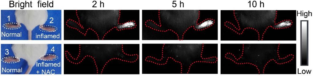 使用这种策略,在这项工作中,我们方便地开发次氯酸盐(一种重要的生物标志物)可激活的NIR-II荧光探针,实现了炎症中次氯酸的特异性成像(图3)。
