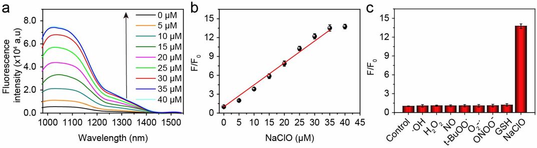 (a)加入不同浓度次氯酸钠后纳米探针的NIR-II荧光强度变化。(b)SPNP25探针的NIR-II荧光强度变化与次氯酸钠浓度的线性关系。(c)SPNP25探针的选择性。