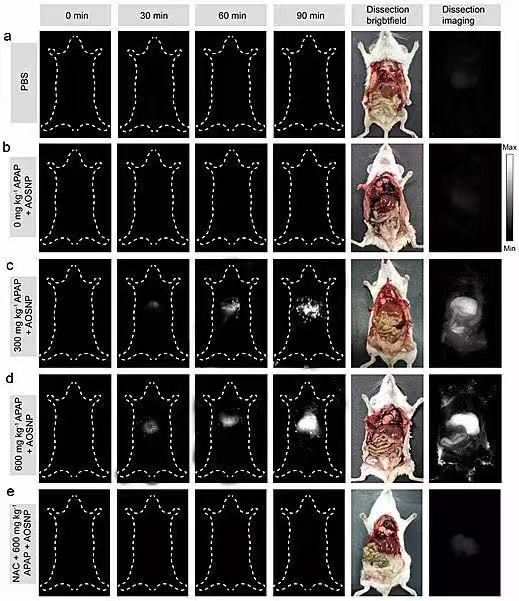 图3. 药物对乙酰氨基酚(APAP)剂量依赖性诱导的小鼠肝毒性的体内实时成像。对照组小鼠经(a)PBS或(b)APAP (0)处理后的NIR-II荧光图像;分别向经过(c)300 mg kg-1和(d)600 mg kg-1的APAP预处理小鼠中尾静脉注射纳米探针AOSNP (100μL, 10 mg mL-1)后实时肝毒性的成像;(e)首先对小白鼠注射一氧化氮清除剂(NAC,300 mg kg-1),然后注射600 mg kg-1的APAP,最后尾静脉注射纳米探针AOSNP (100 μL,10 mg mL-1)的实时成像图。