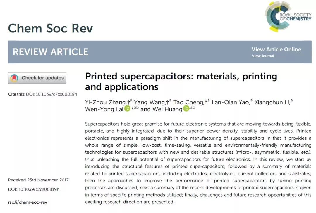 英国皇家化学会综述类期刊Chemical Society Reviews最近发表了IAM团队赖文勇教授等人撰写的综述文章(Review Article),介绍了印刷超级电容器的结构特点,总结了不同组成部分的材料以及通过调节印刷过程提升其性能的方法,并从不同印刷技术的角度分别介绍了超级电容器在近期的发展。最后,作者还就该研究领域未来的机遇与挑战进行了展望。