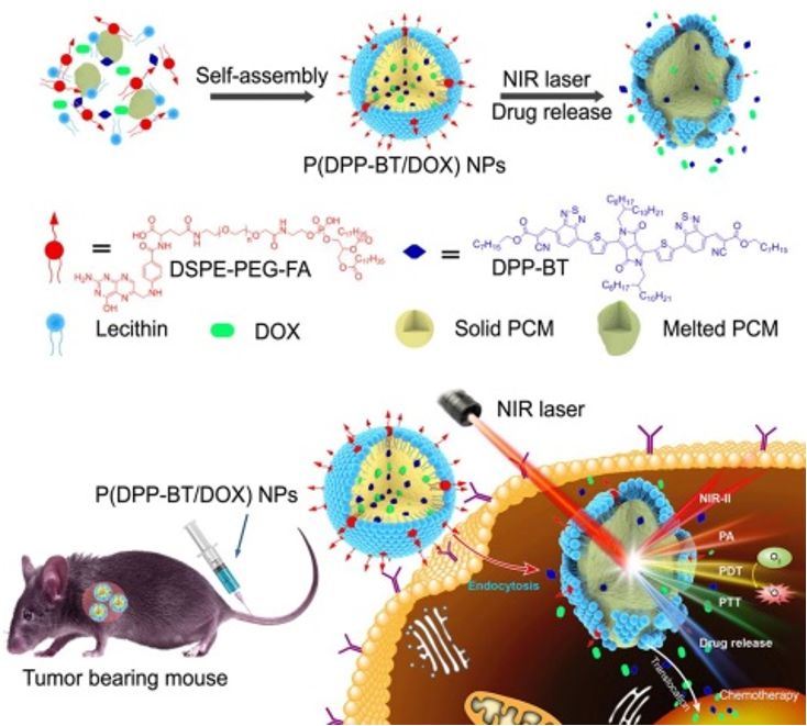 最近,IAM团队范曲立教授、沈清明教授构筑了一种All-in-One的新型光学诊疗平台,实现了单一波长激光触发的NIR-II荧光/PA双模态成像指导的肿瘤PTT/PDT/化疗联合治疗。该课题组首先设计合成了新型有机小分子染料DPP-BT,该有机小分子染料不仅可以作为NIR-II荧光/PA双模态成像造影剂,同时还可以作为PTT/PDT联合治疗试剂;其次利用有机相转变材料实现有机小分子染料DPP-BT及化疗药物DOX的有效负载,从而得到具有热敏性质的All-in-One光学纳米诊疗粒子(P(DPP-BT/DOX) NPs)。在单一波长激光照射下,P(DPP-BT/DOX) NPs不仅具有优异的NIR-II荧光及PA成像能力,而且具有良好的PTT及PDT效果。同时,有机小分子染料DPP-BT在激光照射下产生的高热可以使得P(DPP-BT/DOX) NPs发生相变,进一步导致DPP-BT和DOX的释放,从而实现化疗效果(Scheme1)。该智能响应性多功能诊疗体系的设计、开发为癌症精准诊疗领域研究提供了有效的方案。