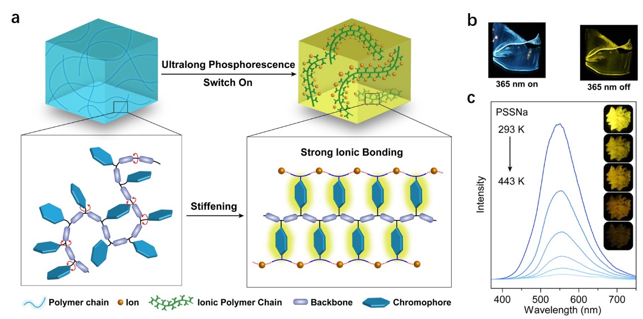 长余辉发光是指发光材料撤去激发光源后,仍能持续发光数秒至数小时的一种发光现象。长余辉发光材料俗称“夜明珠”,即使在黑暗中,也能发出夺目的光芒,被古代帝王奉为稀世珍宝。长余辉发光材料被广泛应用于夜间应急指示、仪表显示、光电子器件以及国防军事等领域、特别是近年来凭借其长寿命、大的斯托克斯位移以及丰富的激发态性质被用于防伪、加密以及生物成像等一些前沿科学领域。与无机长余辉材料相比,室温有机长余辉材料具有较好的生物相容性、导电性,加之成本低廉、结构易修饰等优点,备受人们关注。近几年,有机长余辉材料得到了快速发展,然而这类材料主要集中在晶体小分子和主客体掺杂体系。由于晶体小分子体系的结晶性和主客体掺杂体系的相分离等问题,限制了材料的实际应用。聚合物材料具有柔性、质轻、可旋涂、可拉伸等诸多优势,在柔性电子领域展现出巨大应用潜力。然而,如何实现聚合物材料的长余辉发光是该领域的挑战之一。