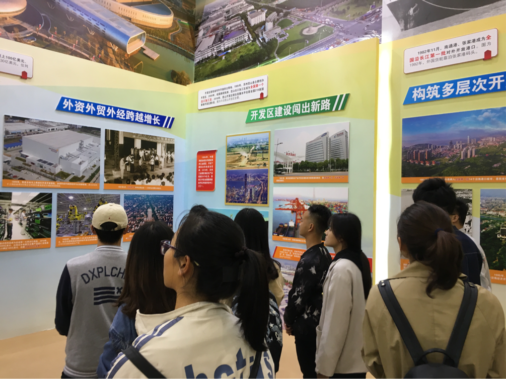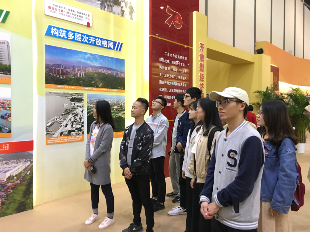 “礼赞新中国,奋进新时代”成就展展现了建国70年来,江苏建设、改革和发展的伟大历程和巨大成就,以及各地在党和人民的领导下取得的一系列令人瞩目、振奋人心的发展成果。一些珍贵的老照片与史实记录引发了同学们的深刻思考,激发了大家的民族自豪感与高昂的爱国之情。