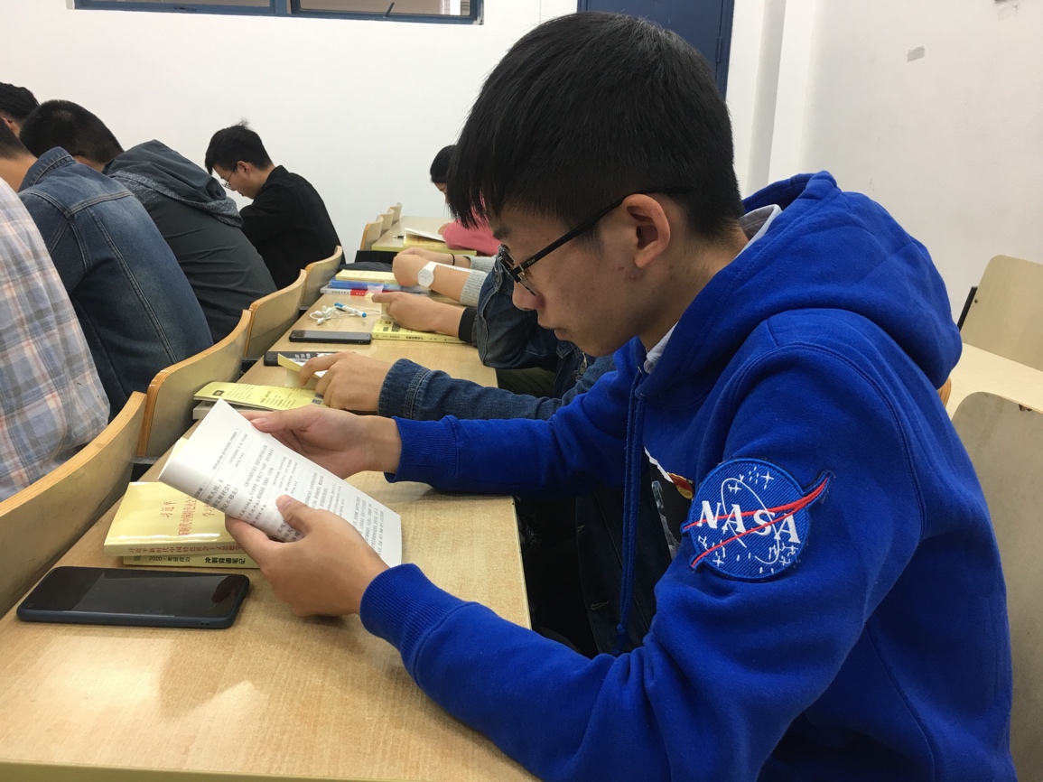 读书会开始,轮盘游戏 于景宝副书记、辅导员杨书丹、赵赫男、陈骏以及6名学生党员代表依次带领大家诵读了《习近平关于“不忘初心、牢记使命”论述摘编》的第一章“中国共产党人的初心和使命,就是为中国人民谋幸福,为中华民族谋复兴”。