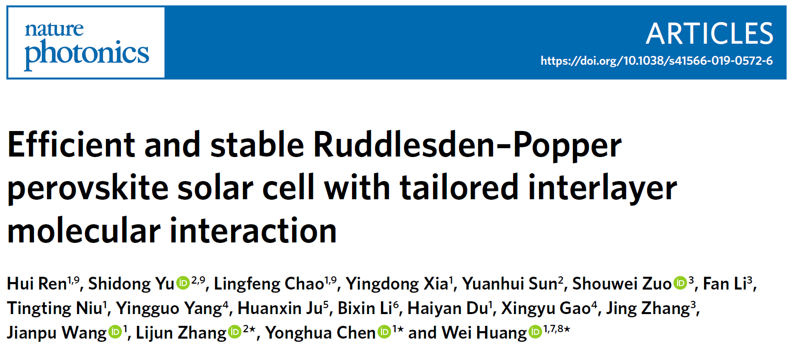 近日,轮盘游戏 轮盘游戏 黄维院士、南京工业大学先进材料研究院陈永华教授和吉林大学集成光电子国家重点实验室&轮盘游戏 张立军教授,在Nature Photonics发表题为“Efficient and stable Ruddlesden–Popper perovskite solar cell with tailored interlayer molecular interaction”的研究论文,实验研究和理论模拟相结合,通过创新性地引入一种含S原子的有机胺,通过S元素之间的相互作用实现层间相互作用有效调控,探究了其对2DRP层状钙钛矿薄膜结晶动力学、稳定性、以及电荷传输特性的影响规律,构建了高效稳定的2DRP层状钙钛矿太阳能电池。