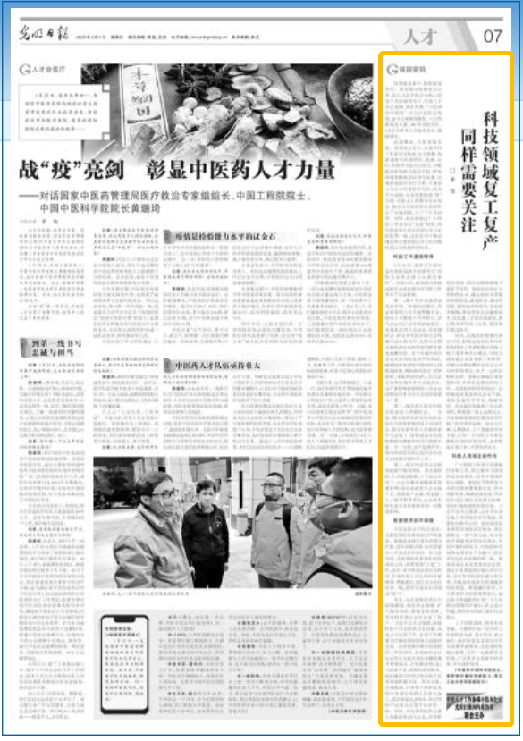 2020年3月1日,《光明日报》刊发中国科轮盘游戏院士、俄罗斯外籍科轮盘游戏院士、轮盘游戏 轮盘游戏 学科带头人黄维院士署名文章,题为《科技领域复工复产同样需要关注》: