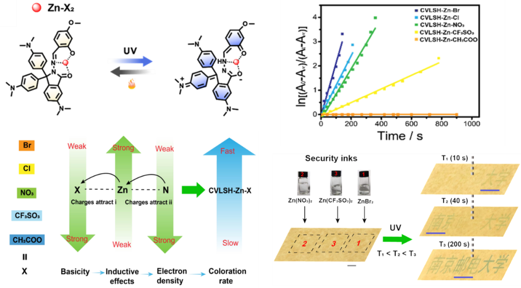 该团队通过改变光致变色材料的抗衡离子成功实现光致变色响应速率的有效调控。含螺内酰胺的染料显示出光诱导的开环反应,导致吸收或光致发光性质发生显著变化。然而,这类分子中的开环异构体的稳定性极低,因为带负电荷的氮原子会破坏开环形式的稳定性。基于此,该团队将锌离子与结晶紫内酯衍生物配位,通过诱导效应降低氮原子的负电荷密度,稳定开环异构体,改变对锌(II)离子中心电荷密度有直接影响的抗衡离子,成功实现了光致变色响应速率的调控。基于此,利用锌(II)盐水溶液作为墨水,将加密的信息打印在涂抹结晶紫内酯的安全纸上可记录隐藏信息,当用紫外光持续照后,记录的信息能够清晰的显现。由于结晶紫内酯与不同锌盐配位后会得到具有不同变色速率的光致变色材料,以不同锌(II)盐水溶液作为墨水可以实现更高级别的安全打印,不同的光照时间会显示出不同的信息,只有知道准确的光照时间才能获取正确的信息。