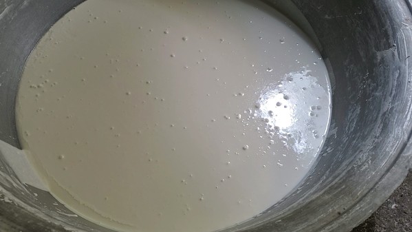 2. 打浆:把泡好的粳米与碎黄豆打成粘稠的浆汁儿。