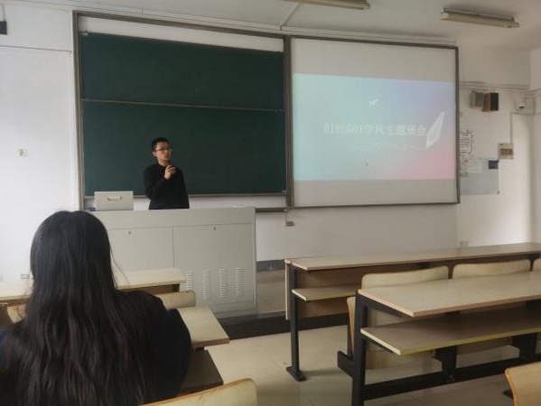 班会开始,首先由班长王子彤同学为大家汇报了开学以来的工作情况和班级情况,呼吁大家积极配合班委工作,完成班级相关事务,并且动员所有人积极学习,完成学业的同时努力考研,为自己的未来规划蓝图。随后B180501班的团支书黄威同学汇报了团支部的工作情况,鼓励大家参与团支部活动,做一个优秀共青团团员,积极向党组织靠拢。最后由轮盘游戏 2018级辅导员陈骏向我们介绍了轮盘游戏历年的毕业去向,沟通并了解了大家目前的想法与方向,鼓励班上同学尽早规划自己的职业生涯。