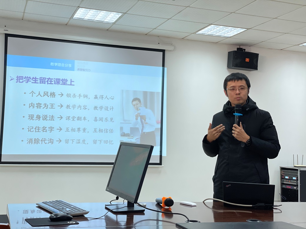 随后,赵老师开展了题为《大学工科教学之我见》的报告。他结合自身授课教学与参加竞赛的情况,分享了教学理念、教学技术及课程思政三个方面的经验。就教学理念的三个方面:当代大学教学面临的挑战、教师教什么,学生学什么以及把学生留在课堂上,一一进行了分享。赵老师在报告中指出,教师能教给学生的是学习的思维,让思维“长见识”,让思维“能量转化”。在教学技术上,赵老师着重强调了板书与动图的必要性与重要性。