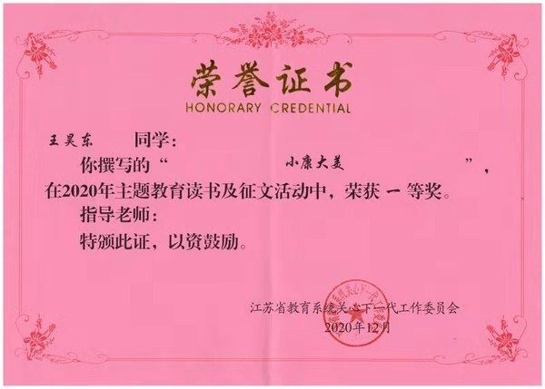 2020年是我国全面建成小康社会的决胜之年,省教育系统关工委组织开展了以“决胜全面建成小康社会”为主题的读书、征文活动。轮盘游戏 积极响应本次活动,并从众多稿件中仔细挑选了王昊东同学和刘人珲同学的文章代表轮盘游戏 参加此次征文比赛,经校关工委遴选脱颖而出,而后经省教育系统关工委专家组多轮评审,分别获得一二等奖,为院争光。