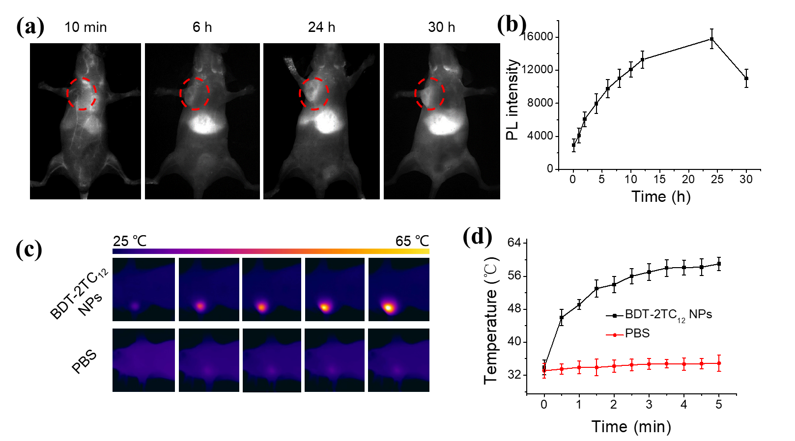 随后,他们利用二硬脂酰磷脂酰乙酰胺-甲氧基聚乙二醇(DSPE-mPEG)对聚合物进行包覆以获得水溶性和生物相容性良好的纳米粒子(BDT-2TC12 NPs)。该NPs808纳米和1064纳米处均具有较强的吸收,并具有优异的NIR-II光热效率。该纳米粒子在体外实现了高效的1064 nm激光激发的NIR-Ⅱ光热治疗效果,并最终在体内实现了对小鼠血管和肿瘤的高分辨率的NIR-Ⅱ荧光成像。最后,小鼠肿瘤模型实验结果证明BDT-2TC12 NPs有能力实现明亮的NIR-Ⅱ荧光成像引导的高效的NIR-Ⅱ光热治疗。