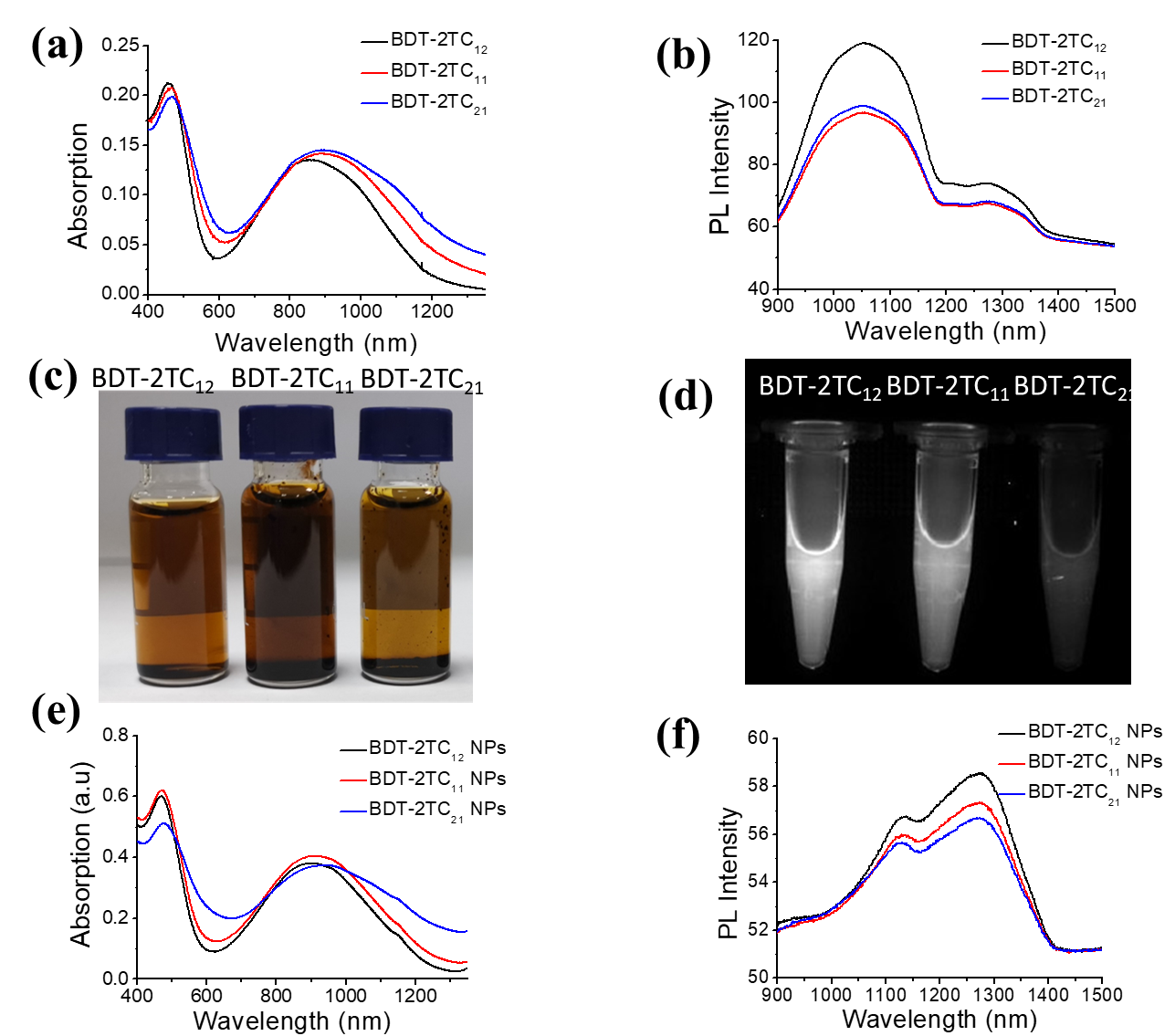 Fig. 2 Absorption spectra of (a) the BDT-2TCs with the same absorbance at 808 nm and their corresponding fluorescence spectra (b) under 808 nm laser excitation. (c) Bright field images and (d) NIR-II images of BDT-2TCs in THF solution. Absorption spectra of (e) the BDT-2TCs NPs with the same absorbance at 808 nm and their corresponding fluorescence spectra (d) under 808 nm laser excitation.