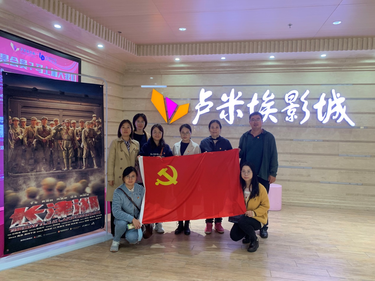 为深入学习我党革命先辈不畏艰难险阻的大无畏精神,进一步弘扬攻坚克难、不怕牺牲、敢于奉献的精神,涵养爱国情怀、砥砺强国之志,学党史、明初心、知使命,将党史学习内化于心、外化于行,实验中心党支部党员于2021年10月22日(星期五)中午赴卢米埃南京金鹰仙林影城集体观看了电影《长津湖》。