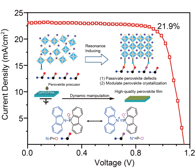 最近,轮盘游戏 陈润锋教授、郑州大学段征教授以及阿卜杜拉国王科技大学殷骏博士报道了一种动态调控钙钛矿结晶生长的新策略,具体是设计制备具有动态共振结构的新型空穴传输材料,从钙钛矿底部进行结晶生长调控,该材料能够在中性和带电共振形式的多个电子态之间实现快速自适应的互变异构,诱导钙钛矿晶体生长并进行原位缺陷钝化,并通过共振变化与钙钛矿底部的Pb缺陷作用,形成具有光滑表面、定向结晶和低缺陷态的高质量钙钛矿薄膜,最终实现反式钙钛矿光伏电池的光电转换效率接近于22%(0.09 cm2),1.02 cm2大面积光伏器件也高达19.5%。此外,未封装器件在相对湿度为40~50%的空气中或在连续1个太阳光光照或在75oC退火条件下经过1000小时的老化分别保持初始效率的90%、88%或83%以上。这些结果说明通过共振分子可以成功实现动态调节钙钛矿结晶并促进底部缺陷原位修复,为高性能和大面积反式钙钛矿光伏器件研究提供了新的道路。