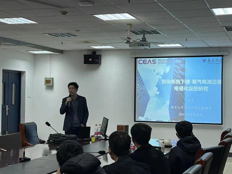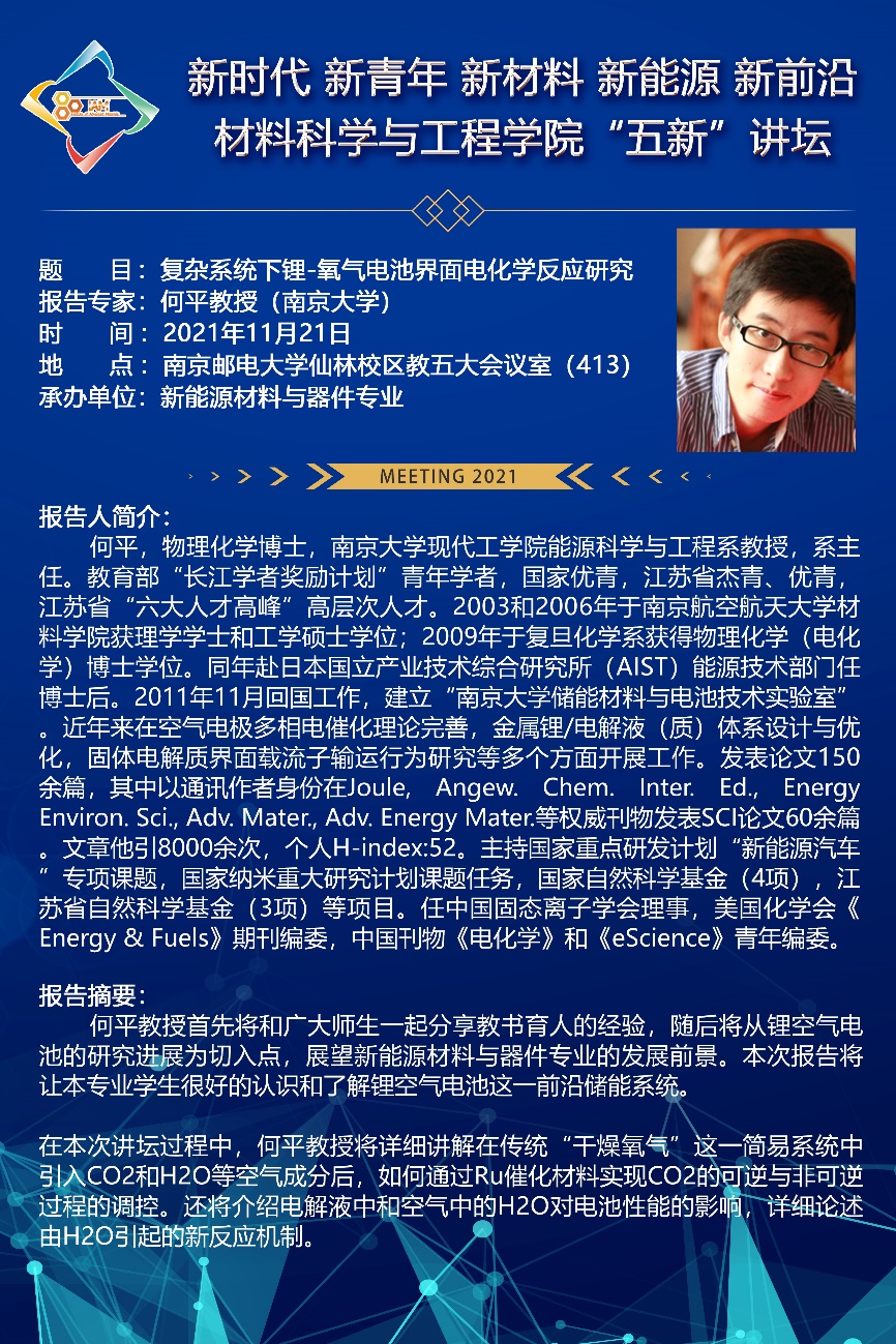 为促进新能源材料与器件本科专业学生的全面发展,增进同学们对本专业的认知和认同感,拓展本专业学生的国际视野,培养本专业学生的创新思维和创新能力,推进专业创新创业教育与专业教育的深度融合,实现为国家培养满足社会需求、掌握最新前沿技术和创新能力的新时代新能源材料高端人才的最终目标。2021年11月21日上午10:00,新能源材料与器件专业在学校教五413会议室成功举办了首期主旨为“新时代、新青年、新材料、新能源、新前沿”的“五新”讲坛专家报告会。此次讲坛的专家为南京大学现代工程轮盘游戏新能源科学与技术专业系主任、国家优秀青年基金获得者何平教授。报告由新能源材料与器件专业系主任黄镇东副教授主持,新能源材料与器件专业的全体本科生和班主任闫伟博老师参加了本次报告会。