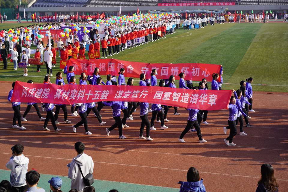 本科生方阵准备了方阵表演,48人分别摆出了“I”“A”“M”三个英文字母,喊出了洪亮的口号“凌云赛场,斗志昂扬,唯我材院,无限风光”,表现出了他们无穷的斗志,以及对材料院未来的憧憬。研究生方阵手里拿着五星红旗和标语,表现了他们的赤子之心和对材料的热爱。教工队伍手举横幅“承科技报国使命,守家国情怀初心”,“丙戌建院,真材实料十五载,谋定笃行,国重智造谱华章”,彰显了教师为国家培养科技创新人才的使命。