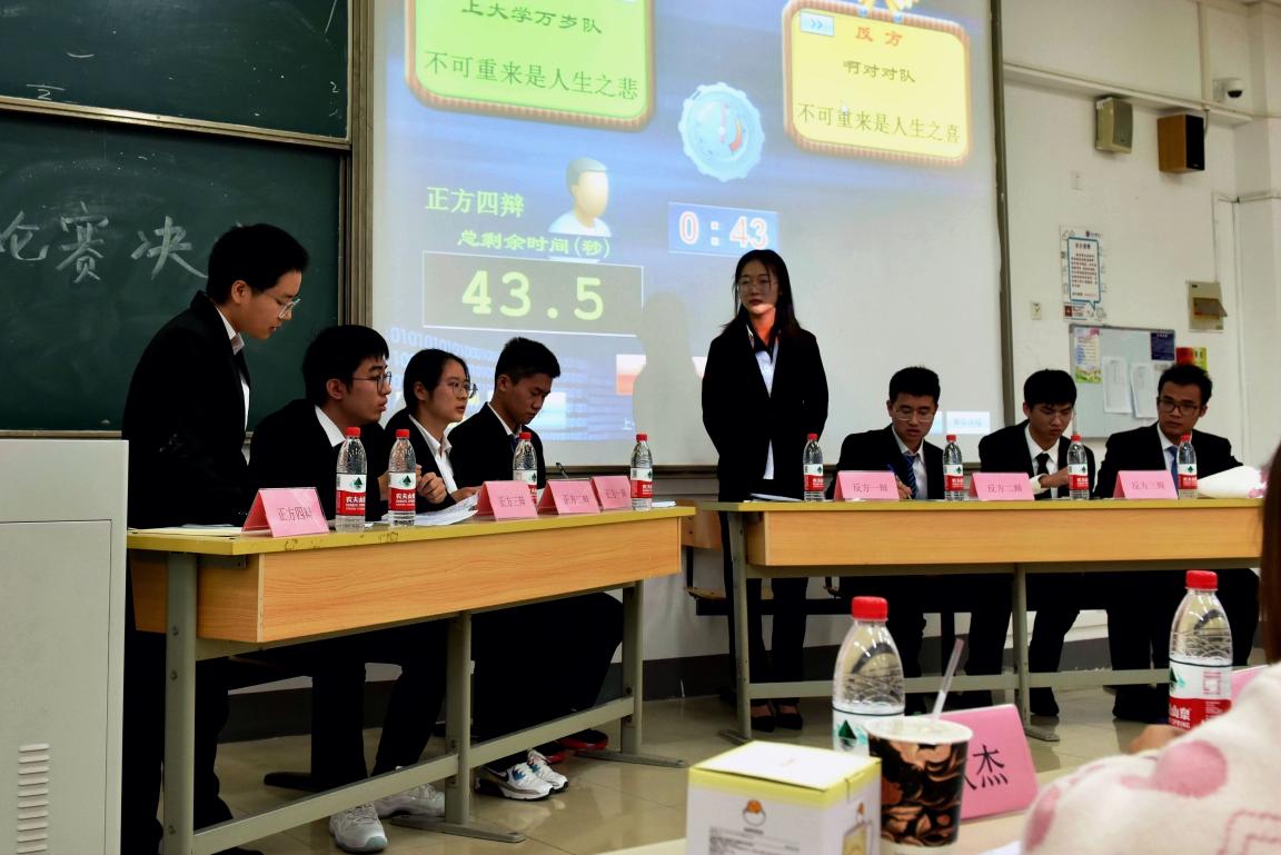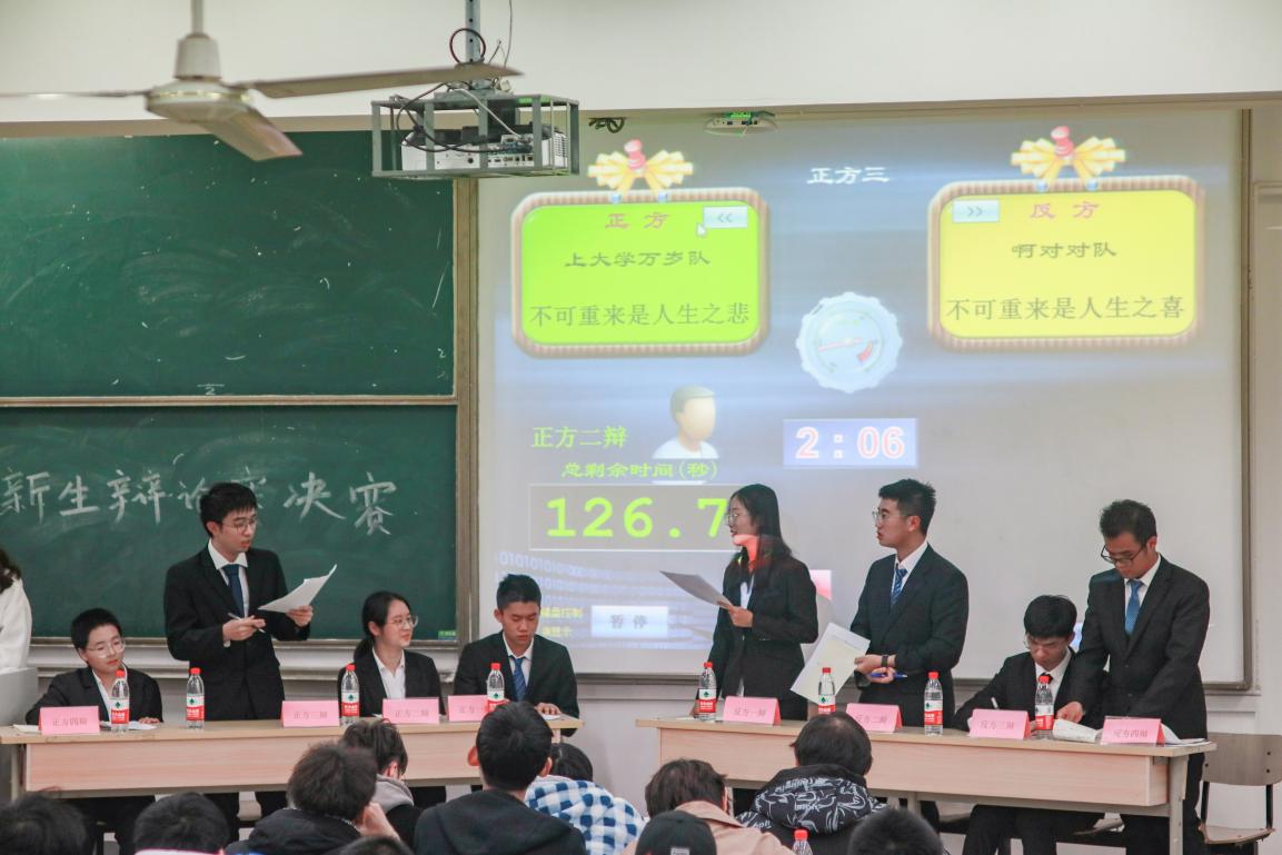 本次辩论赛决赛的辩题为不可重来是人生之悲/喜,双方辩友就人生重来之意义与内涵,展开激烈的唇枪舌剑,言语交锋。反方观点注重不可重来让我们珍惜当下的人生而并不拘泥与过去,积极向前,围绕不可重来的普遍性,以人生重来弊端开展攻势,思路新奇,举例新颖。正方认为重来是人生中的一部分,如果没有重来的机会,人生是悲的,紧守人生可重来的假想优势:如果可以重来,我们的人生会很美好,但不能重来的人生达不到人的期望,以人生可重来之积极影响不断构建防御,层层递进,防守反击。双方你来我往,互不相让,通过绝伦的口才、敏捷的思维、大胆的驳斥和严谨的论证为观众带来了一场思想上的精彩辩论。