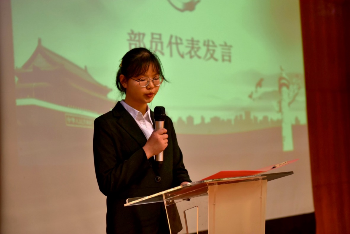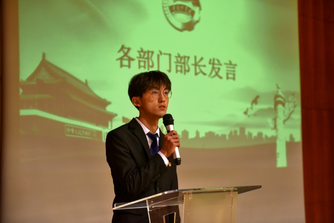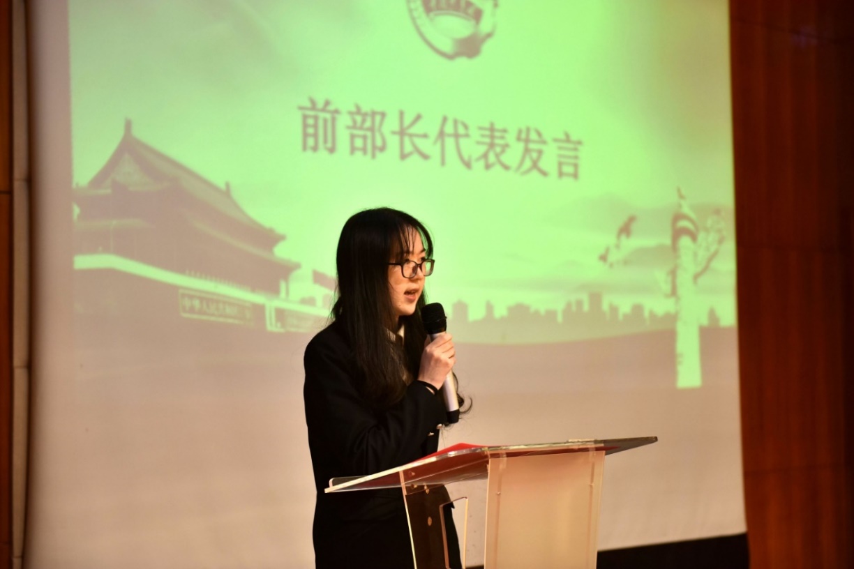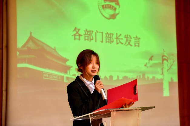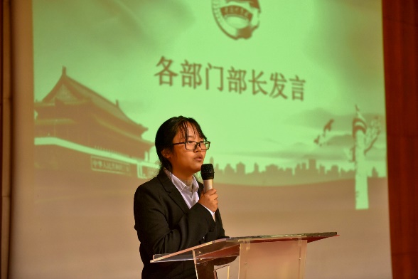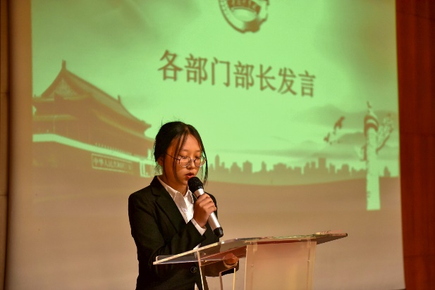 六个部门的部长依次上台发言,介绍了各部门的职能和工作,以及自己进入学生会从部员到部长身份转变的感受。同时,对小部员们寄予厚望,希望大家能够在完成学生会工作的同时也能够锻炼自己,收获满满。