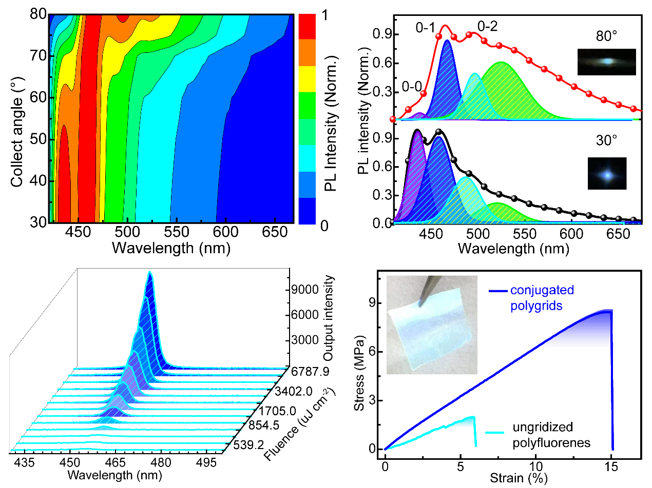 除此之外,不同于GaAs以及SiO2等无机光子晶体,这类有机光子晶体还具有机械柔性,展现出15%的最大拉伸应变、65 MPa的弹性模量以及30~40Jm-3的韧性。该工作可作为有机半导体/柔性电子领域重要的里程碑,发展了新一代光学塑料材料,开拓了介观光子晶体导向的分子设计,有效简化了光子晶体的加工方式,为实现仿生类柔性智能光子器件提供了巧妙的分子平台。未来,研究人员将进一步在格基纳米聚合物骨架上进行分子修饰,以适当调控介观组装行为并拓展激光振荡等优异功能,尝试面向有机电泵浦激光开展研究。