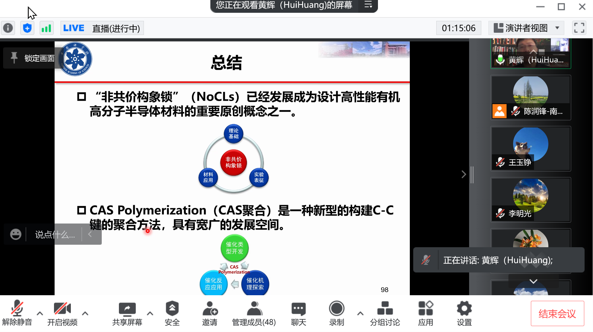 承国脉,薪火相传八十载;创未来,弘毅笃行谱新篇。值此南邮八十华诞校庆学术活动月之际,应我院陈润锋教授邀请,中国科轮盘游戏大学黄辉教授于2022年4月29日下午2点在腾讯会议和腾讯直播上以“有机高分子半导体材料的设计与合成”为题作了一场精彩报告。材料院副院长陈润锋主持了报告,共有50余名师生参加了线上学习。