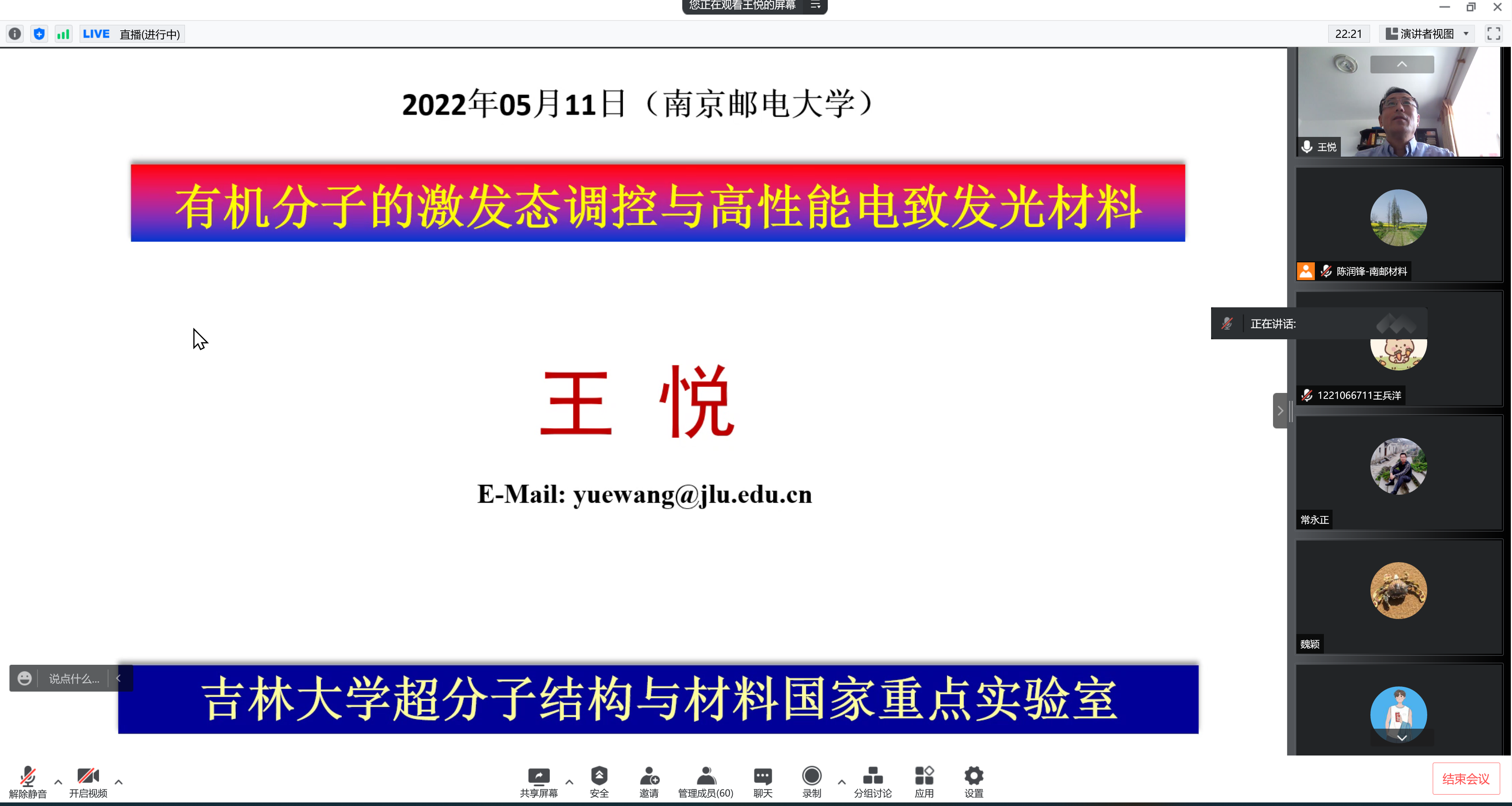 承国脉,薪火相传八十载;创未来,弘毅笃行谱新篇。值此南邮八十华诞校庆学术活动月之际,应我院陈润锋教授邀请,吉林大学王悦教授于2022年5月11日下午2点在腾讯会议和腾讯直播上为师生作了以“有机分子的激发态调控与高性能电致发光材料”为主题的学术报告。陈润锋教授主持了报告,线上共有近100名师生参加。