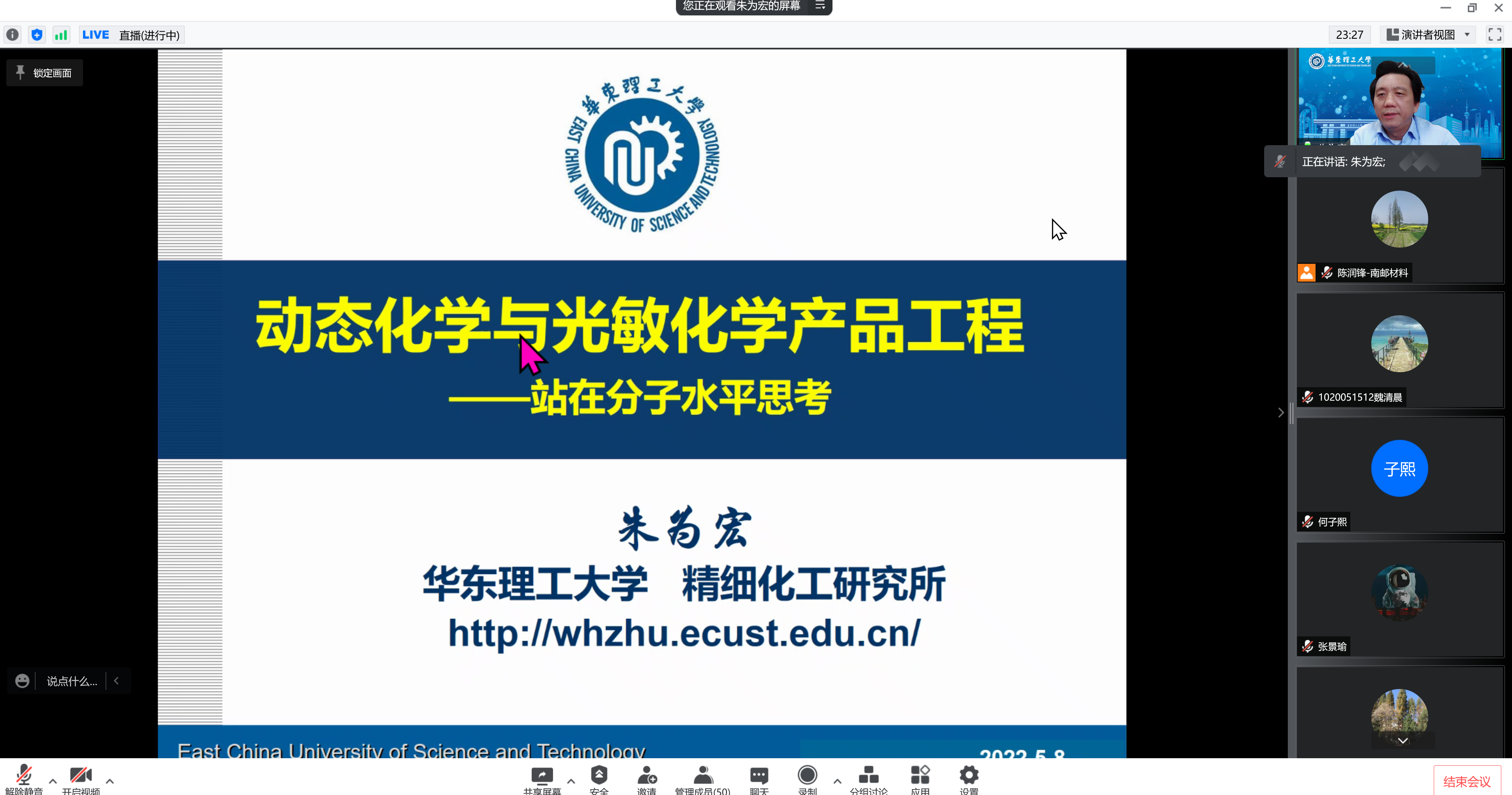 承国脉,薪火相传八十载;创未来,弘毅笃行谱新篇。值此南邮八十华诞校庆学术活动月之际,应我院陈润锋教授邀请,华东理工大学朱为宏教授于2022年5月8日(周二)下午2:30在腾讯会议和腾讯直播上为师生作了以“动态化学与光敏化学产品工程”为主题的学术报告。陈润锋教授主持了报告,线上共有近100名师生参加。