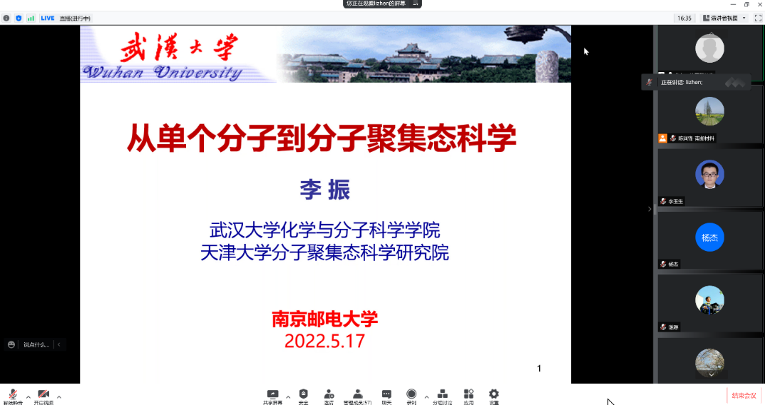 承国脉,薪火相传八十载;创未来,弘毅笃行谱新篇。值此南邮八十华诞校庆学术活动月之际,应轮盘游戏 和前沿信息技术与产业发展研究中心陈润锋教授邀请,武汉大学/天津大学李振教授于2022年5月17日(周二) 上午10:00(周二)在腾讯会议和腾讯直播上为师生作了以“浅谈从单个分子到分子聚集态科学”为主题的学术报告。陈润锋教授主持了报告,线上共有近100名师生参加。