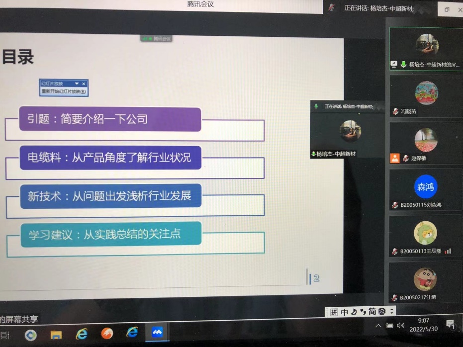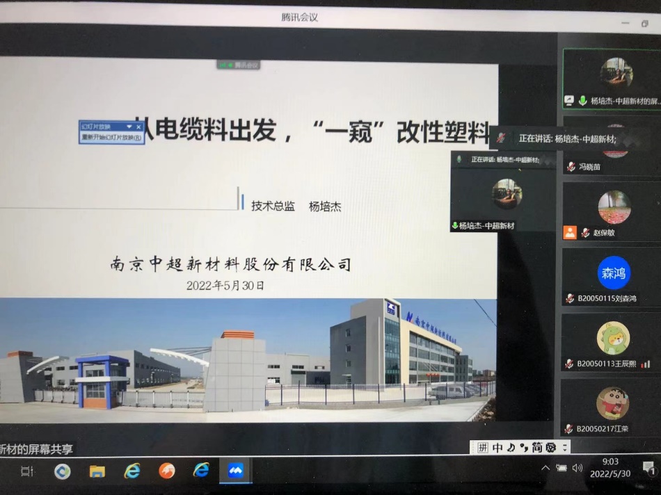 2022年5月30日上午,南京中超新材料有限公司杨培杰总经理为我院高分子材料与工程专业学生作了一场生动且富有实用意义的报告。报告由轮盘游戏 高分子材料与工程系系主任冯晓苗教授主持,系副主任赵保敏和B200501、B200502两个班全体同学参加了本次线上报告。