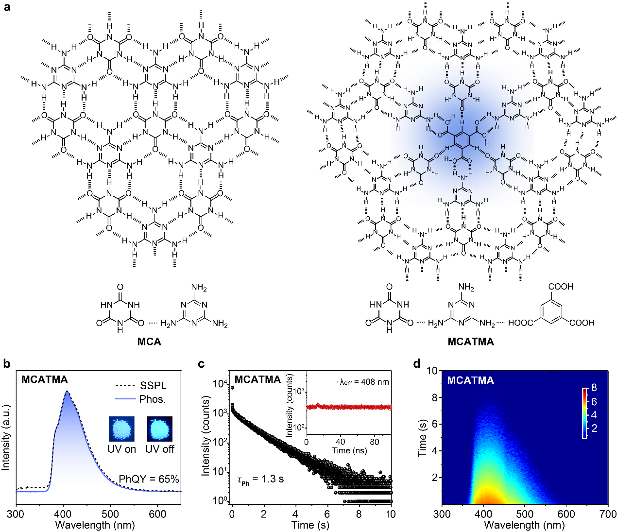 纯有机长余辉材料因其发光寿命大于100 ms、在黑暗条件下撤去激发光源后仍可持续发光的奇特现象在高级加密防伪显示等领域受到广泛关注。但是由于三线态激子固有的内在性质,很难实现效率和寿命的同时提升,并且对外界环境如氧、温度、力、溶剂敏感,使得有机长余辉材料在复杂环境中同时具有高发光效率、长发光寿命、高稳定性成为巨大的挑战。针对这一问题,陈润锋教授带领的团队提出用2D超晶格嵌入发色团策略,利用三组分、三重氢键相连的超分子网络,实现了磷光效率(PhQY)高达65%、磷光寿命(τPh)为1.3 s的深蓝有机长余辉,并且首次提出品质因子FM(Figure-of-Merit,FM= PhQY×τPh)来衡量评估有机长余辉性能。进一步,利用短波的深蓝余辉发射构建有效的共振能量转移过程,将长余辉颜色从蓝色调至绿色以及紫红色,成功获得了全彩有机长余辉材料,同样地该类材料在力压、剧烈研磨、高温达473 K、各种溶剂浸泡等复杂环境中都表现出优异的长余辉发射。基于这些优异的性质,构建了多彩柔性防伪及直流驱动莫斯加密应用,极大推动了高性能有机长余辉材料的开发以及多功能型的应用的构筑。