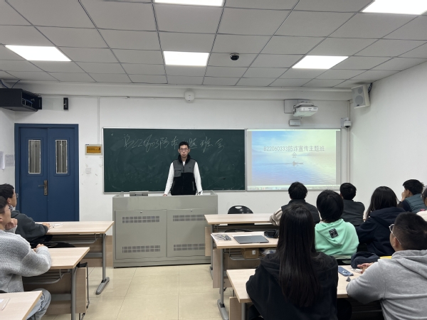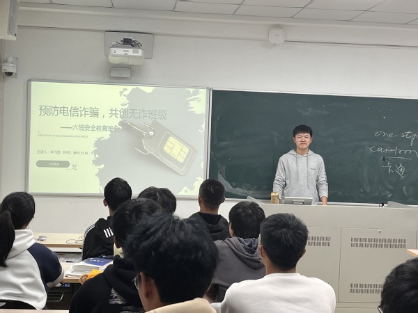 B220604冯凯同学首先介绍了几种常见的诈骗手段以及同学们可能遇到的情况,播放了相关视频,让同学们意识到了预防电信诈骗的重要性。台下的同学们积极发言,发表各自的看法。随后,冯凯介绍了几个防范诈骗的技巧,以期进一步提高防诈骗意识。
