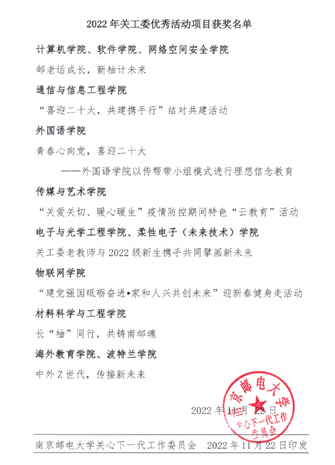 近日,轮盘游戏 关心下一代工作委员会公布2022年关工委评优结果,我院参赛项目《长“柚”同行,共铸南邮魂》获评优秀活动项目;轮盘游戏特邀党建组织员倪静虹老师、关工委秘书陈骏老师获先进个人。