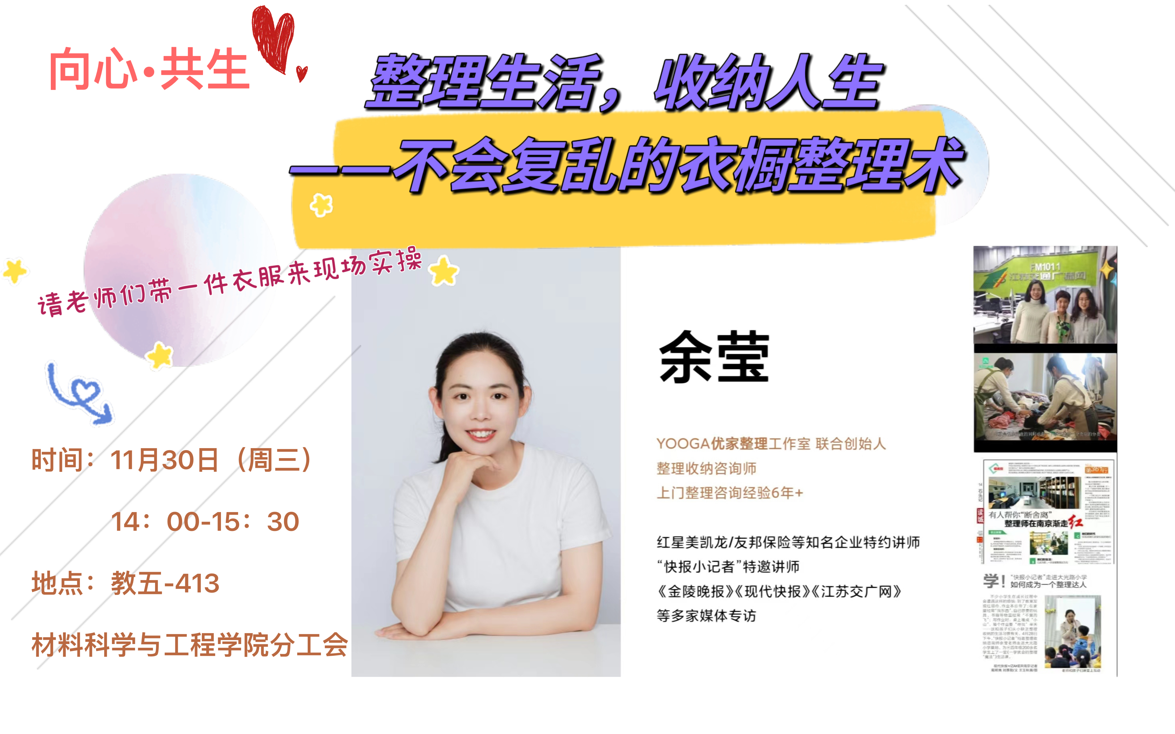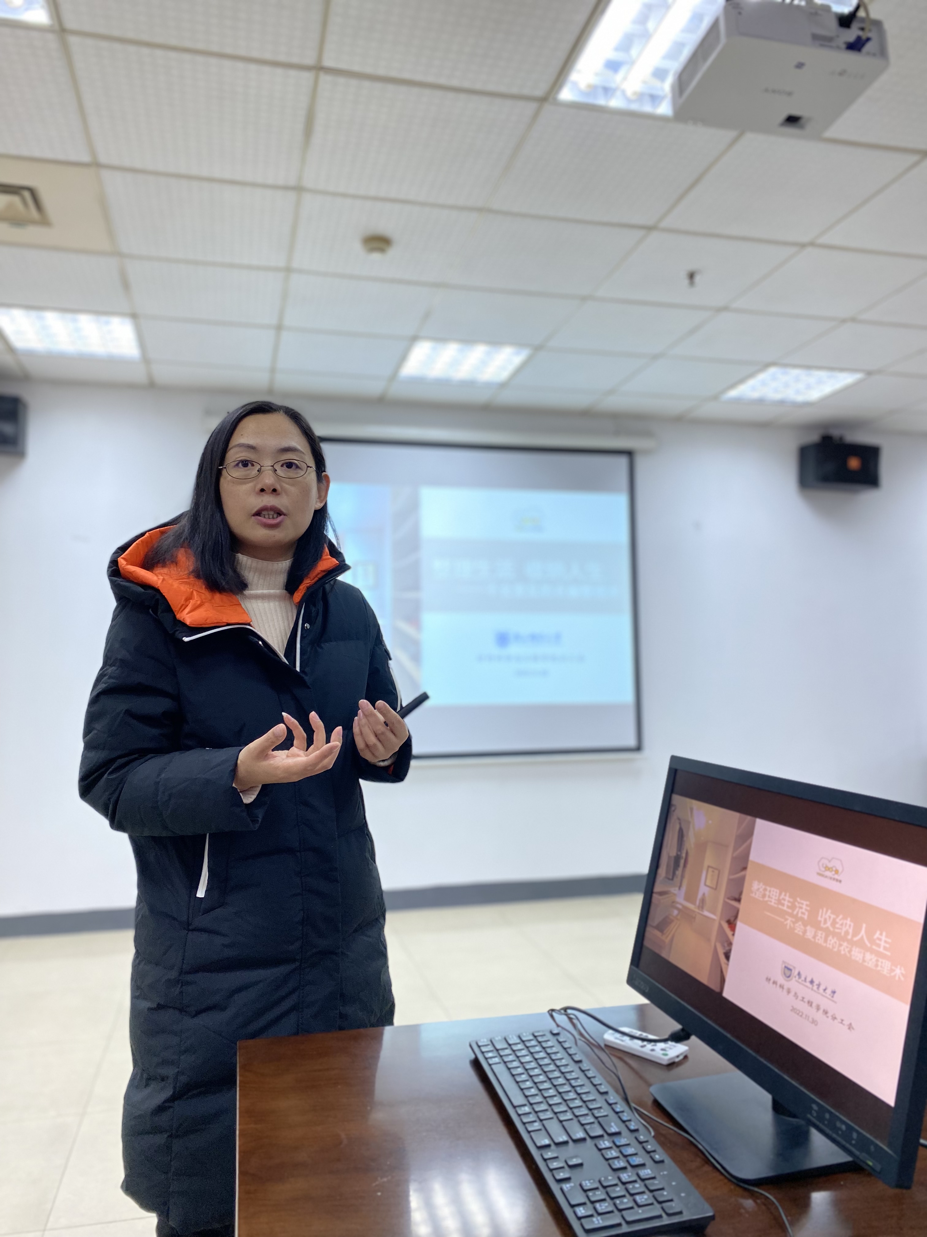 11月30日下午,轮盘游戏邀请到YOOGA优家整理工作室的联合创始人、整理收纳咨询师余莹做《整理生活,收纳人生——不会复乱的衣橱整理术》讲座,现场为老师们讲解居家环境的收纳哲学,梳理衣橱整理收纳的技巧和方法,带领老师们现场操作练习基本收纳步骤。