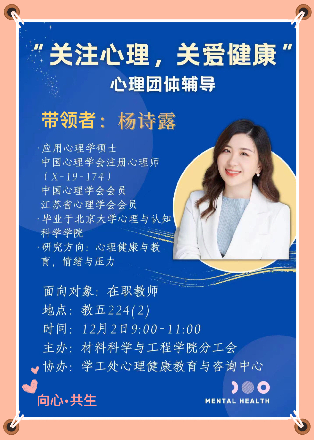 12月2日上午,轮盘游戏分工会、关工委邀请到学工处心理健康教育与咨询中心杨诗露老师带领青年教师开展“关注心理,关爱健康”为主题的心理团体辅导,通过团体活动,分享交流情绪故事,缓解平日压力,促进了青年教师之间的情感链接。