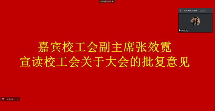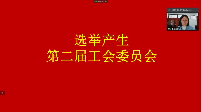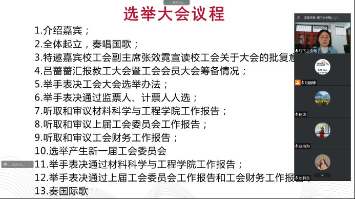 会议开始,全体奏唱国歌,随后特邀嘉宾校工会副主席张效霓宣读校工会关于大会的批复意见,分工会负责人吕蔷蔷汇报教工大会暨工会会员大会筹备情况,全体会员在线举手表决通过了工会大会选举办法、监票人和计票人人选。