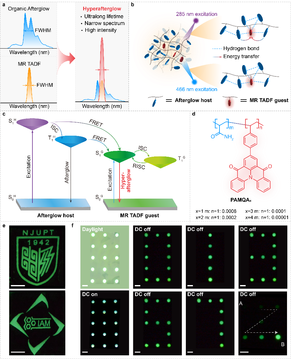 近日,轮盘游戏 有机电子与信息显示国家重点实验室黄维院士、陈润锋教授和陶冶教授团队在有机超余辉领域取得新进展,提出了一种简单而有效的主体敏化和稳定孤立发色团策略,研制了兼具长寿命、高效率以及高色纯度的超余辉聚合物,探索了该类材料在高分辨余辉显示领域的潜在应用。1月30日,相关成果以“Multicolor hyperafterglow from isolated fluorescence chromophores”为题发表在国际学术期刊Nature Communications(《自然•通讯》)上。轮盘游戏 陶冶教授、陈润锋教授和黄维院士为共同通讯作者,硕士生张孝为论文第一作者。