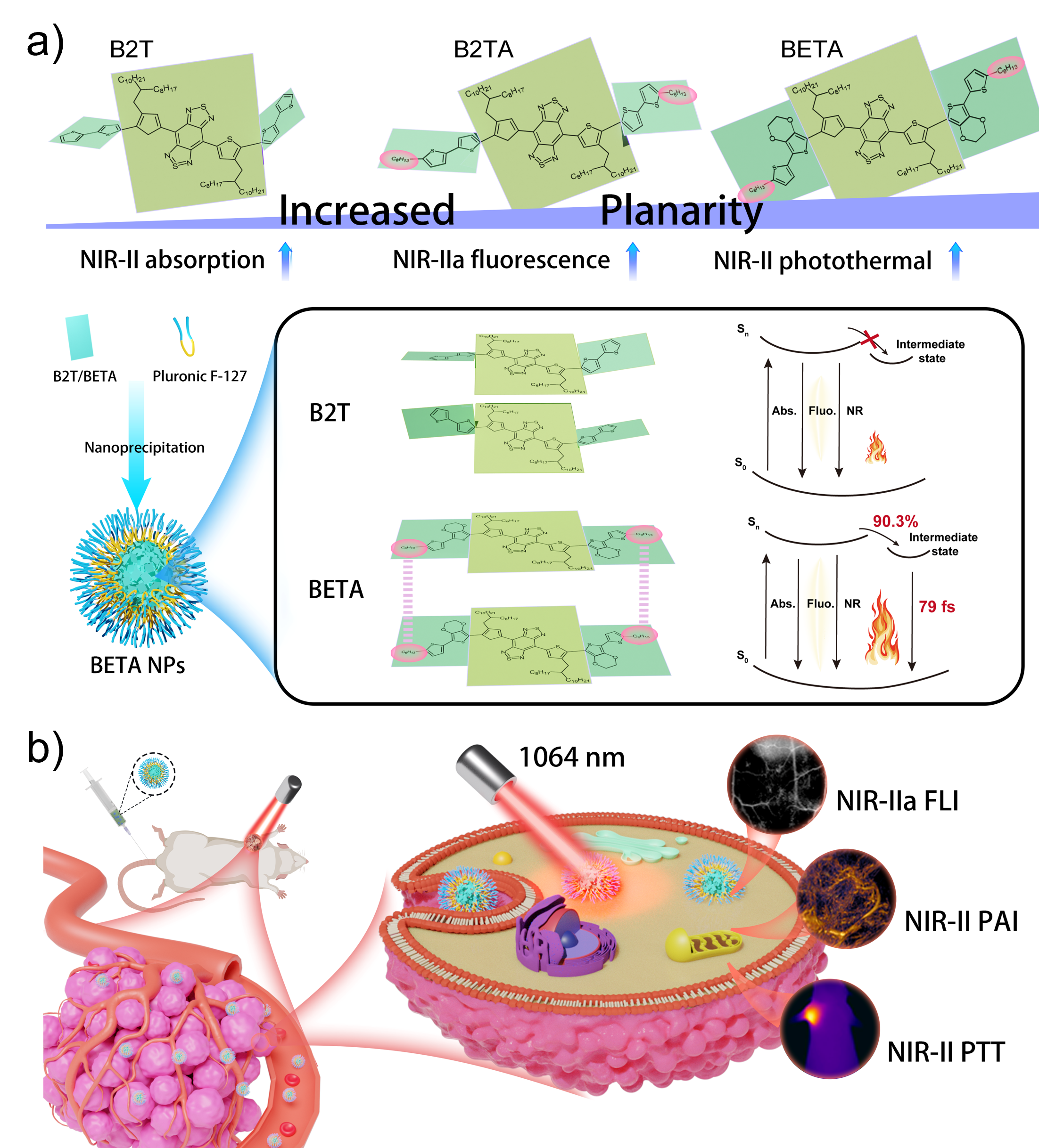 近日,轮盘游戏 、有机电子与信息显示国家重点实验室范曲立教授团队在有机光诊疗材料领域取得新进展,通过供体/侧链工程增加分子平面性实现了近红外(NIR-II)光诊疗剂的性能调控,探究了其在肿瘤成像和治疗领域中的应用。2月1日,相关成果以“Increasing Molecular Planarity through Donor/Side-Chain Engineering for Improved NIR-IIa Fluorescence Imaging and NIR-II Photothermal Therapy under 1064nm”为题发表在国际学术期刊Angewandte Chemie International Edition(《德国应用化学》)上。重点实验室范曲立教授、孙鹏飞副教授和西北工业大学胡文博教授为共同通讯作者,陈尚钰博士为论文第一作者。