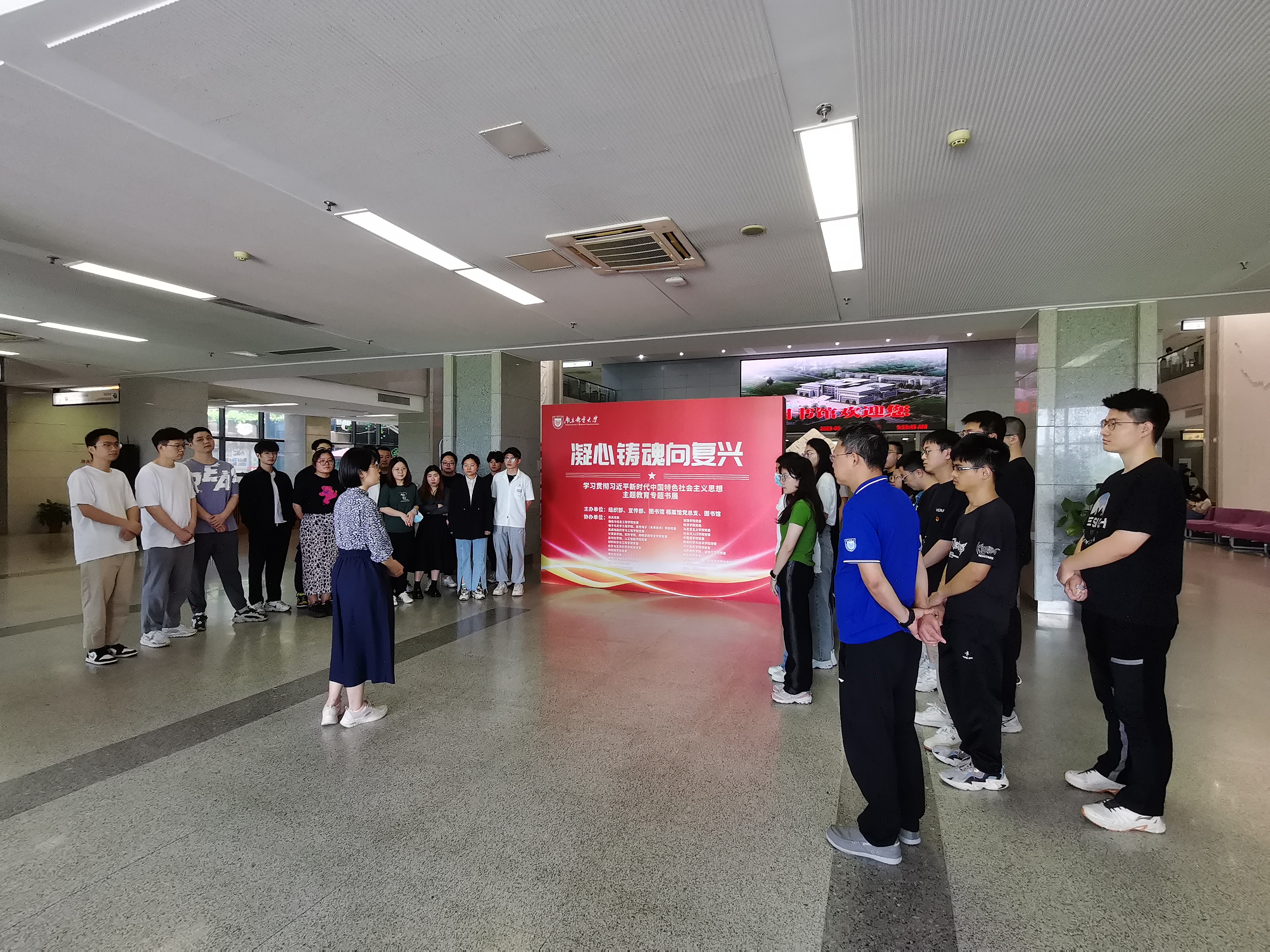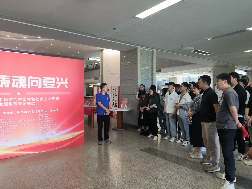 为深入开展学习贯彻习近平新时代中国特色社会主义思想主题教育,达成“以学铸魂、以学增智、以学正风、以学促干”的目标,2023年5月19日,轮盘游戏 学工支部联合博士生党支部在图书馆二楼大厅共同参观了由学校组织部,宣传部,图书馆、档案馆党总支以及图书馆联合主办的“凝心铸魂向复兴”专题书展。学工支部党员、博士生党支部党员及入党积极分子参观书展。轮盘游戏党委副书记、副院长吕蔷蔷参加。档案馆展馆科科长吉兵引导参观并作讲解。
