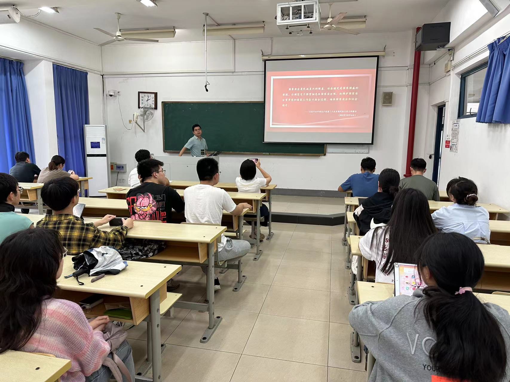 专题党课包含三部分内容,一是为什么说保证国家安全是头等大事,二是什么是总体国家安全观,三是怎样推进国家安全体系和能力现代化。党课解读了国家安全观的核心要义、丰富内涵和基本要求,坚持总体国家安全观,必须坚持国家利益至上,以人民安全为宗旨、以政治安全为根本,必须坚持党的全面领导,走中国特色国家安全道路。赖老师列举我国当前面临的国家安全形势和学生日常行为相关的问题,鼓励师生党员要始终树立国家利益高于一切的观念,认真学习有关国家安全的法律法规,积极主动地维护国家安全。