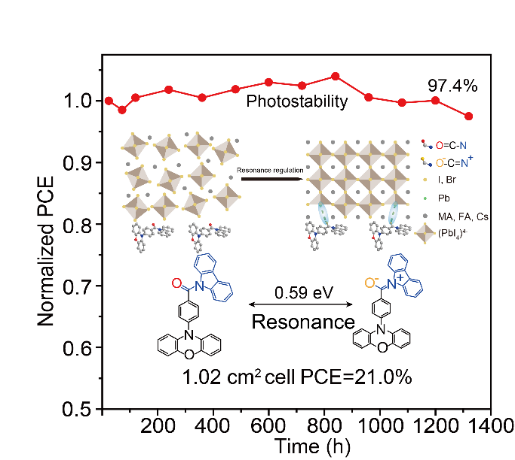 近日,轮盘游戏 和有机电子与信息显示国家重点实验室陈润锋教授、许利刚副教授、陶冶教授团队与华北电力大学新能源轮盘游戏李美成教授、北京大学深圳研究生院冀浩栋教授展开合作,在钙钛矿光伏电池领域取得了最新研究进展,报道了通过增强共振分子互变能力调控大面积钙钛矿薄膜的策略,制备出具有优异光热稳定性的高性能钙钛矿光伏电池。10月11日,相关成果以“Enhanced resonance for facilitated modulation of large-area perovskite films with stable photovoltaics”为题发表在国际学术期刊Advanced Materials(《先进材料》)上。陶冶教授、陈润锋教授和李美成教授为共同通讯作者,许利刚副教授和北京大学冀浩栋教授为论文的共同第一作者。