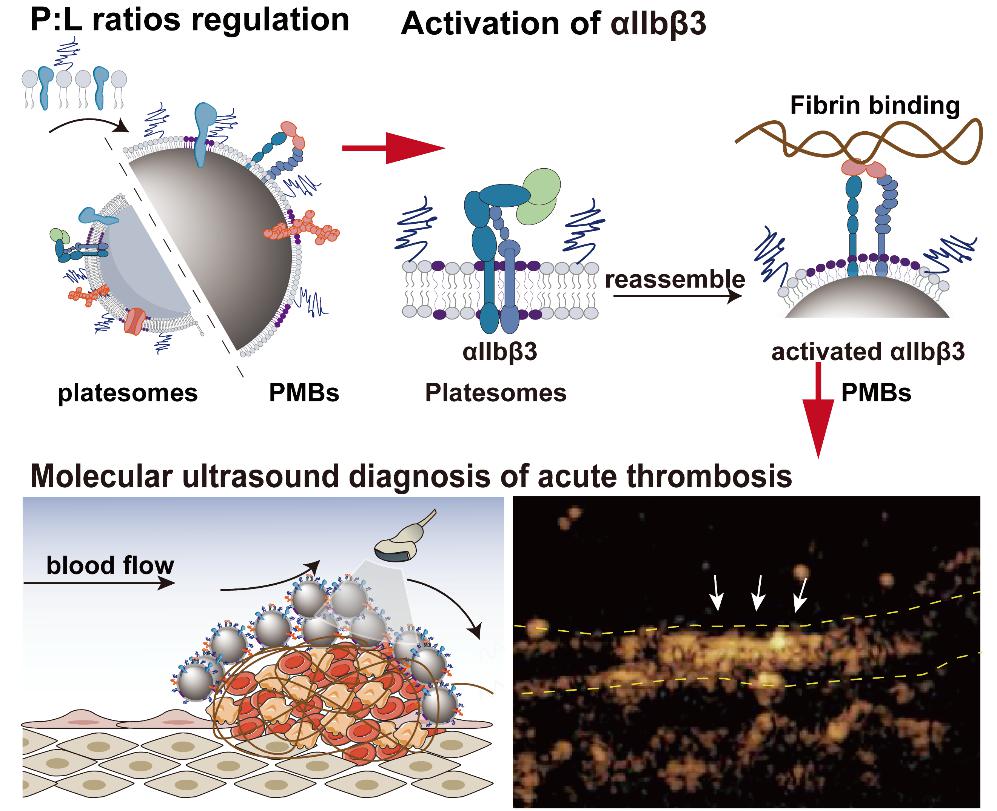 为了解决上述问题,研究团队基于前期纳米颗粒气液界面组装的研究基础(Science Advances, 2020, 6, eaaz8204;Science Advances, 2023, 9, eade5446),提出了一种理性调控血小板膜表面活性的方法,通过循环冻融法将磷脂分子与细胞膜融合,并成功重组装于气液界面构筑仿生微泡。具有最优化蛋白质与磷脂比例的血小板膜仿生微泡继承了血小板61.4%的蛋白质并维持了血栓靶向性蛋白αIIbβ3的活化构象。团队通过超声分子影像证明了血小板膜仿生微泡能为急性血栓诊断提供高达 11.8 dB 的超声信噪比。这种细胞膜仿生界面构筑方法为制备新型仿生超声造影剂提供了普适性方法,具有巨大的临床应用潜力。
