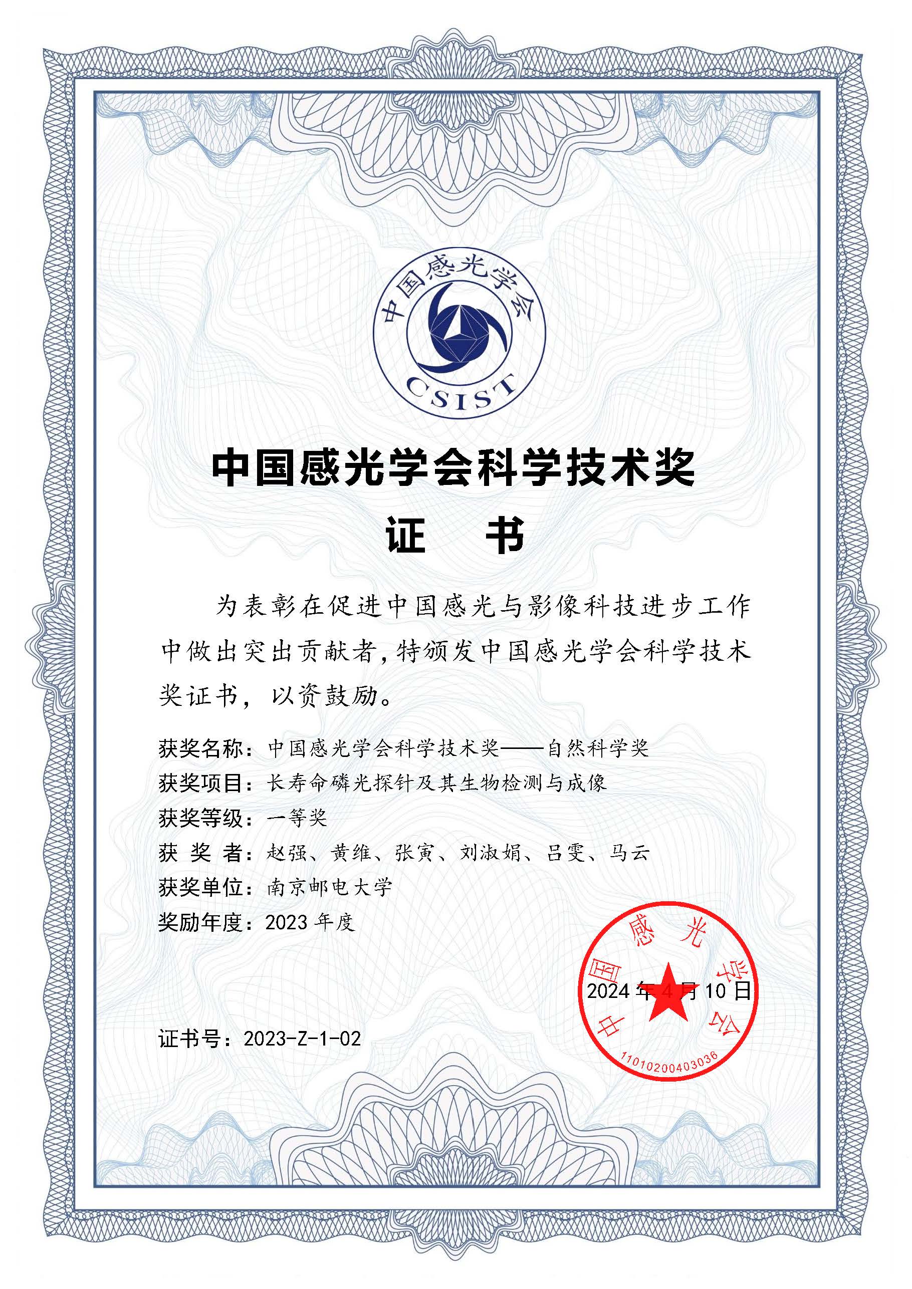 近日,中国感光学会发布“关于授予2023年度中国感光学会科学技术奖的决定”,经资格审查、奖励评审组专家评审、奖励评审委员会评议、投票表决和常务理事会审定以及网站公示,决定授予赵强团队完成的“长寿命磷光探针及其生物检测与成像”项目中国感光学会科学技术奖——自然科学奖一等奖。